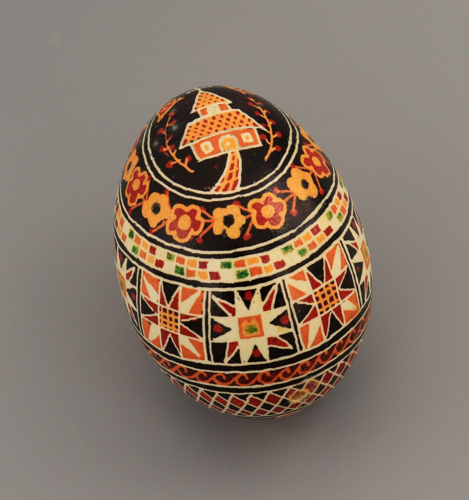 The egg design is a tradition in Ukraine, Hungary, Poland, and the former Yugoslavia. Its origins date back to prehistoric times, when decorated pebbles replaced the egg. The egg itself represents creation and life, while the colors and symbols have a multitude of different meanings.