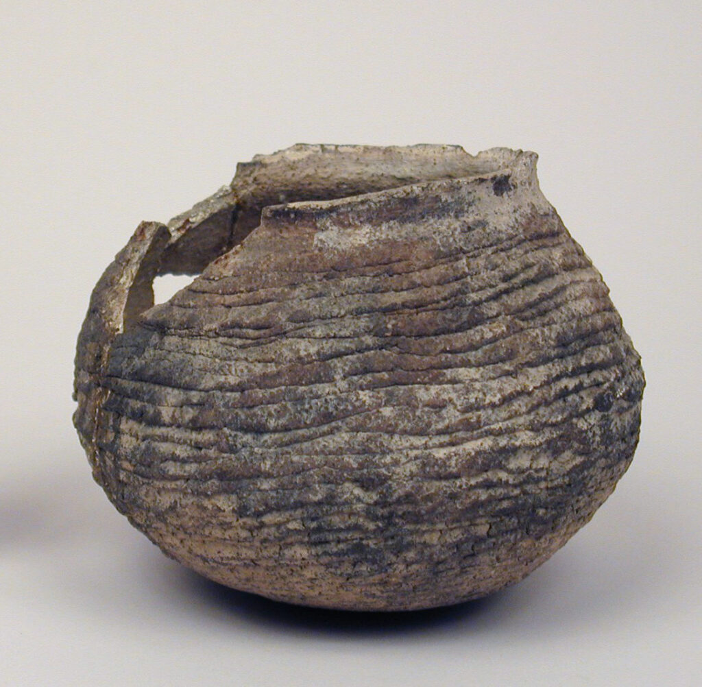 Cette pièce est un excellent exemple de poterie en colombin. Cette technique dans l'art de la céramique existe depuis la préhistoire. Elle consiste à superposer de longs boudins d'argile, appelé colombins, obtenus en roulant un morceau de terre avec la paume des mains. La pièce se solidifie en pressant les colombins les uns contre les autres puis en lissant la surface au fur et à mesure que s'élève la pièce. Nous avons malheureusement peu d'informations sur la provenance de cette pièce collectionnée par le Père Carrier, sinon que c'est une pièce d'origine autochtone.